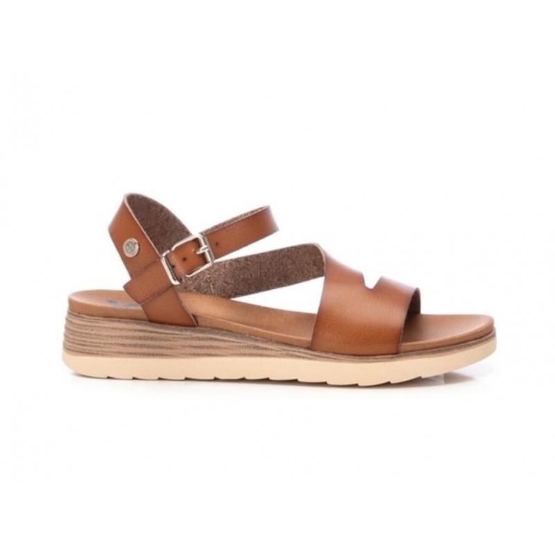 Bequeme lederfarbene Keilsandaletten mit gekreuzten Bändern
