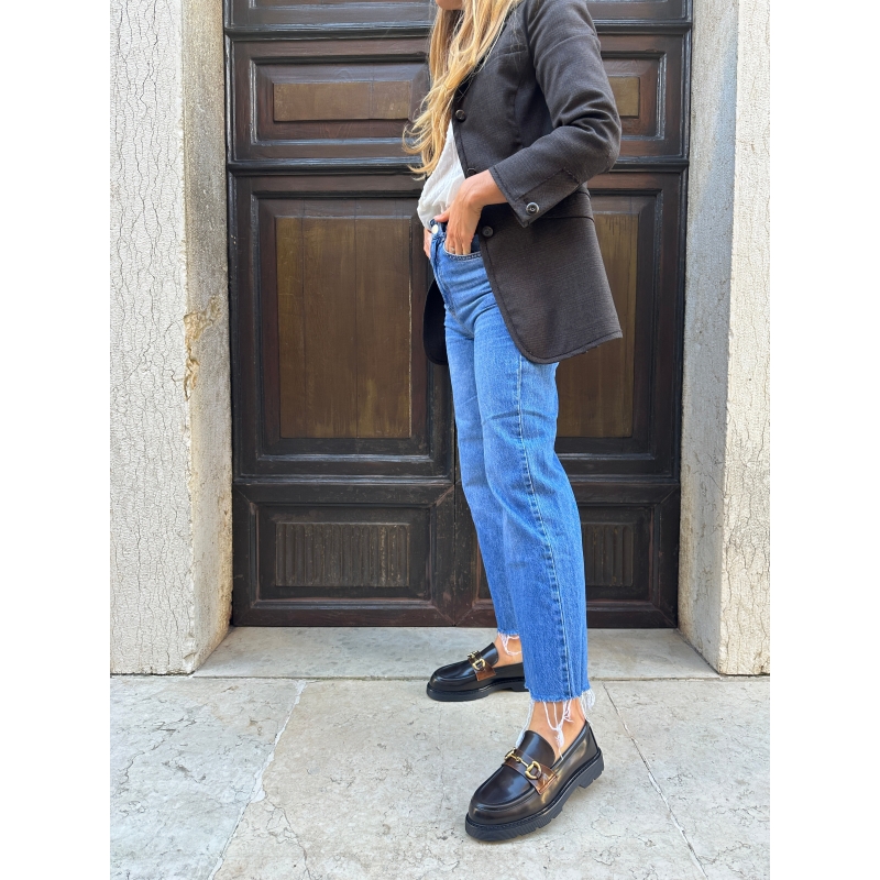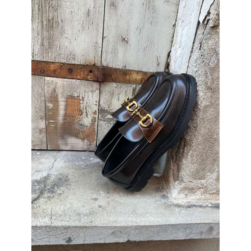 Zweifarbiger veganer Mokassin in Dunkelbraun und Leder