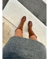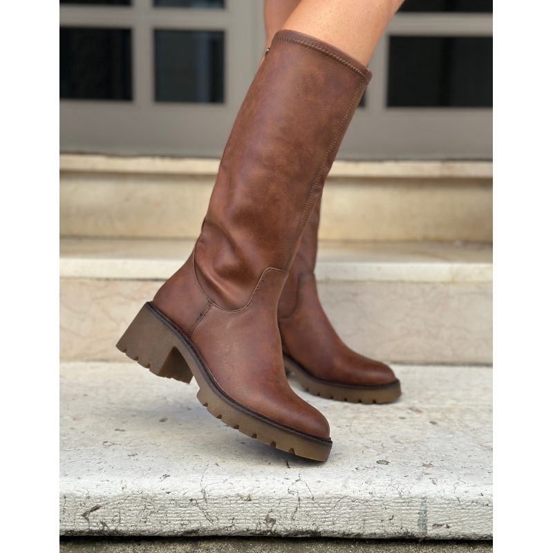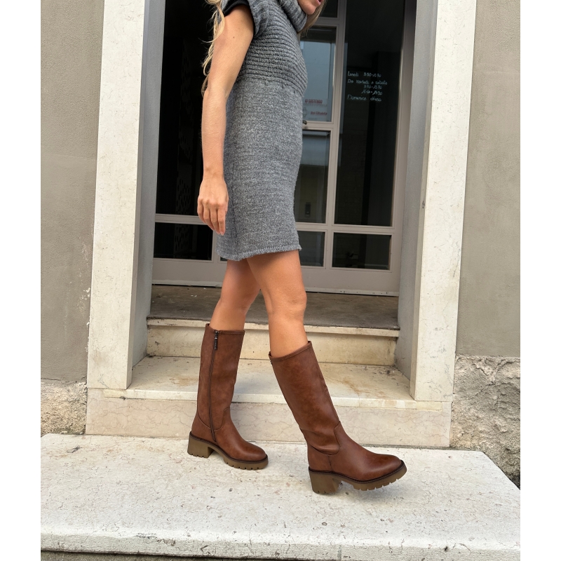 Brauner, wadenlanger veganer Damenstiefel mit durchgehendem seitlichen Reissverschluss.