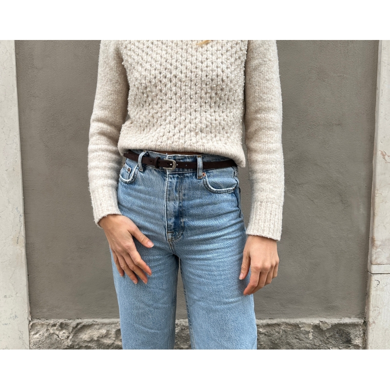 Schmaler, brauner Gürtel in Wildlederoptik. Längenverstellbar.