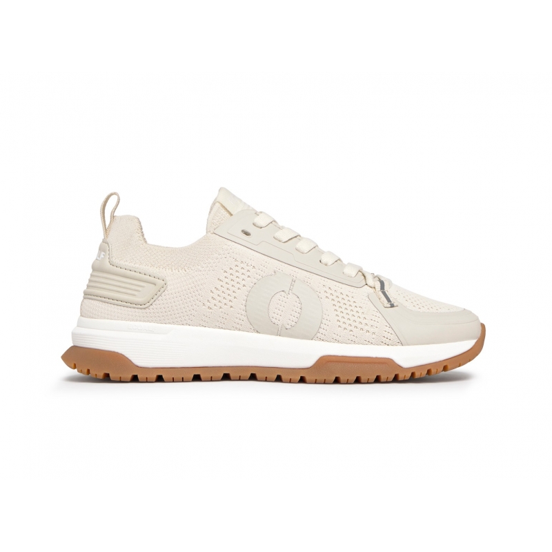 Sneaker aus cremefarbenem Strickmaterial mit beigen und grauen Details