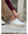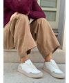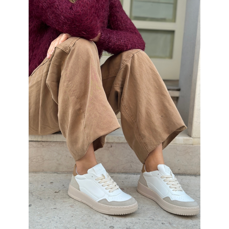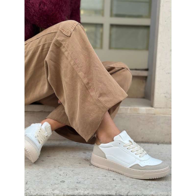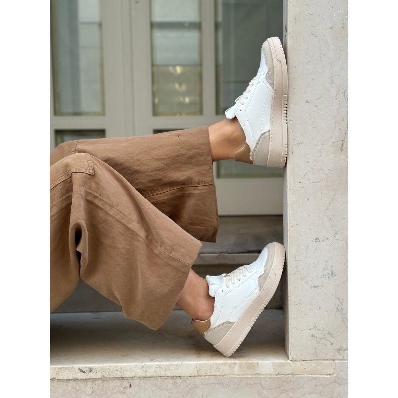 Weisse vegane Mais-Sneaker mit haselnussbrauner Fersenlasche und beigefarbenen Einsätzen in Wildlederoptik