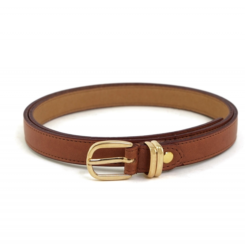 Umweltfreundlicher dünner lederfarbener Gürtel mit abgerundeter goldener Schnalle und doppelter goldener Metallschlaufe