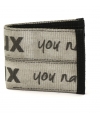 Recycelte vegane Geldbörse, weiss und grau, mit schwarzer Schrift