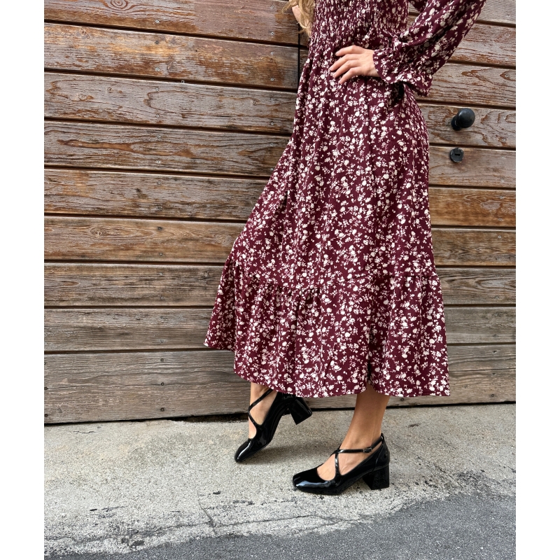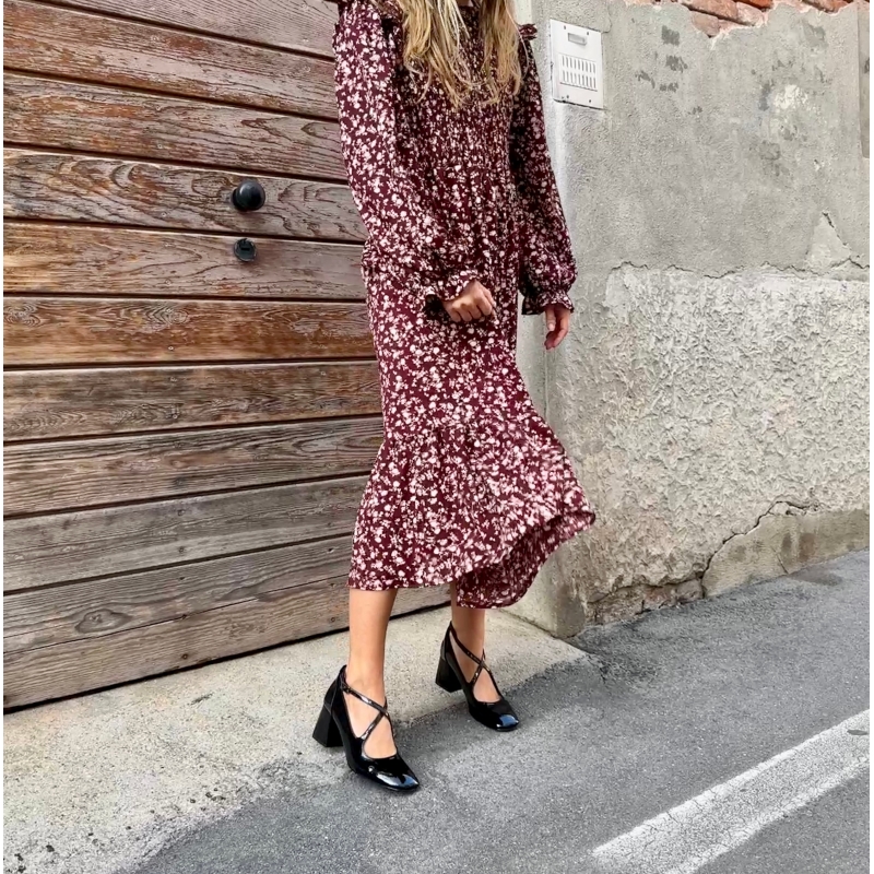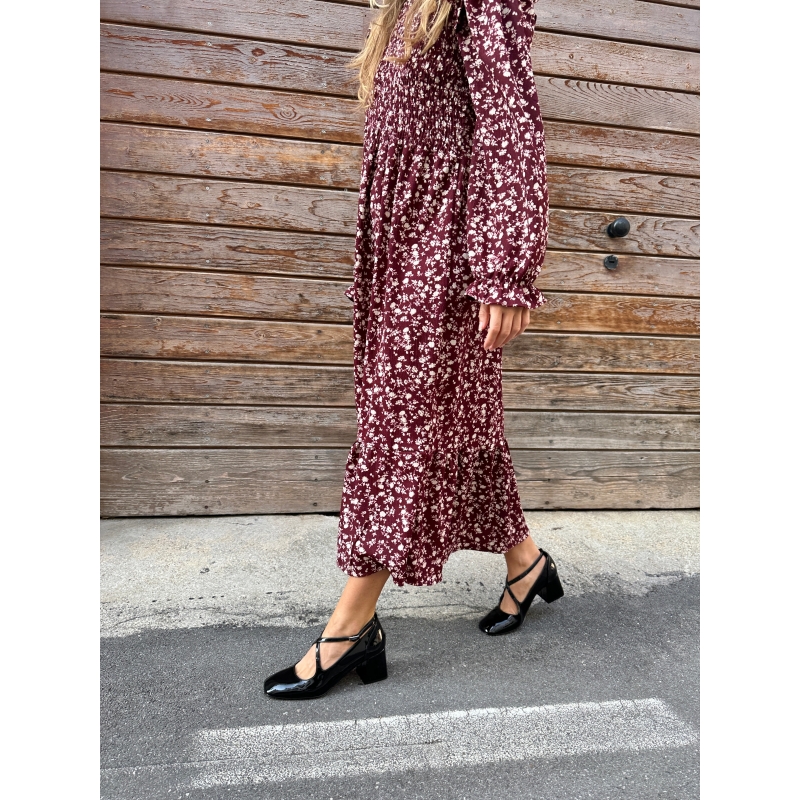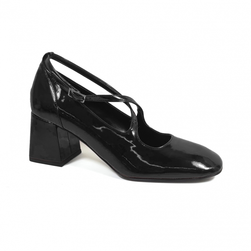 Modell mit quadratischer Spitze und doppelt geflochtenem Riemen am Spann