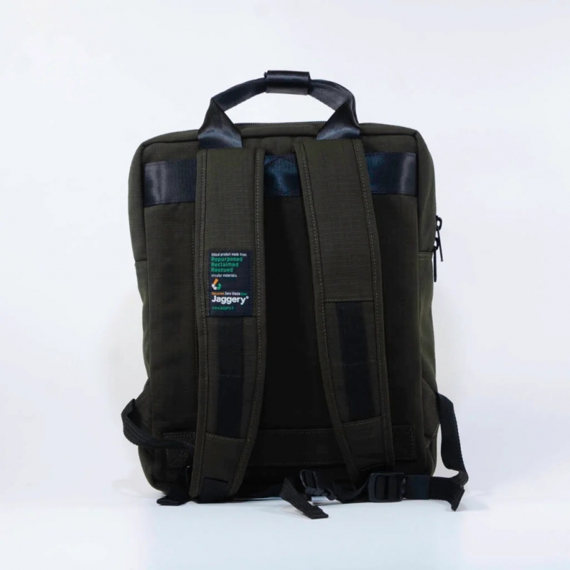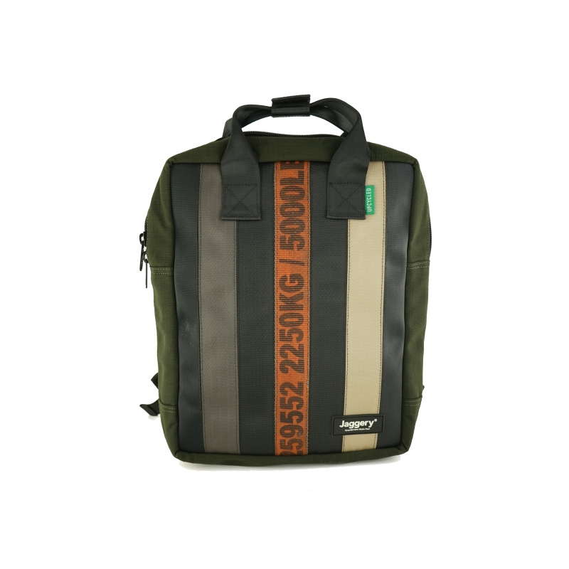 Recycled green backpack with zip closure that can also be used as a handbag