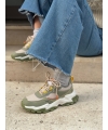 Upper in soft sage-colored microfiber with colored details and mesh inserts