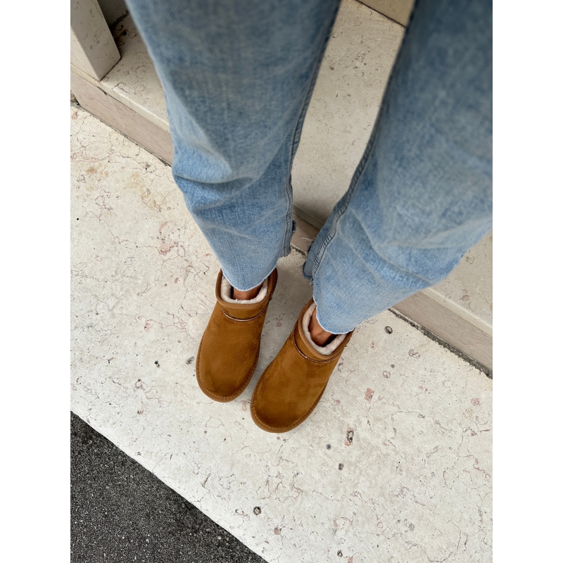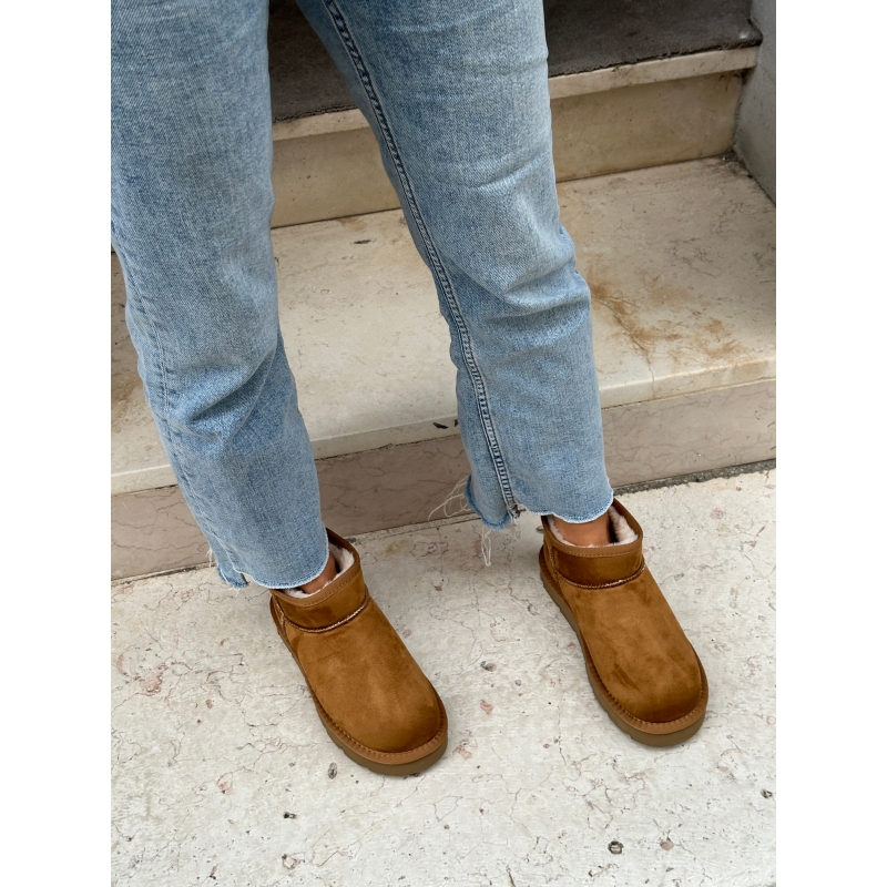 Brown leather-colored plush ankle boots with faux fur padding