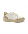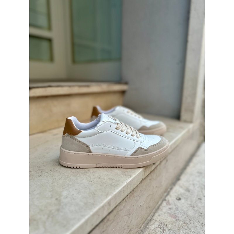 White vegan corn sneakers with hazelnut heel tab and beige suede-effect inserts