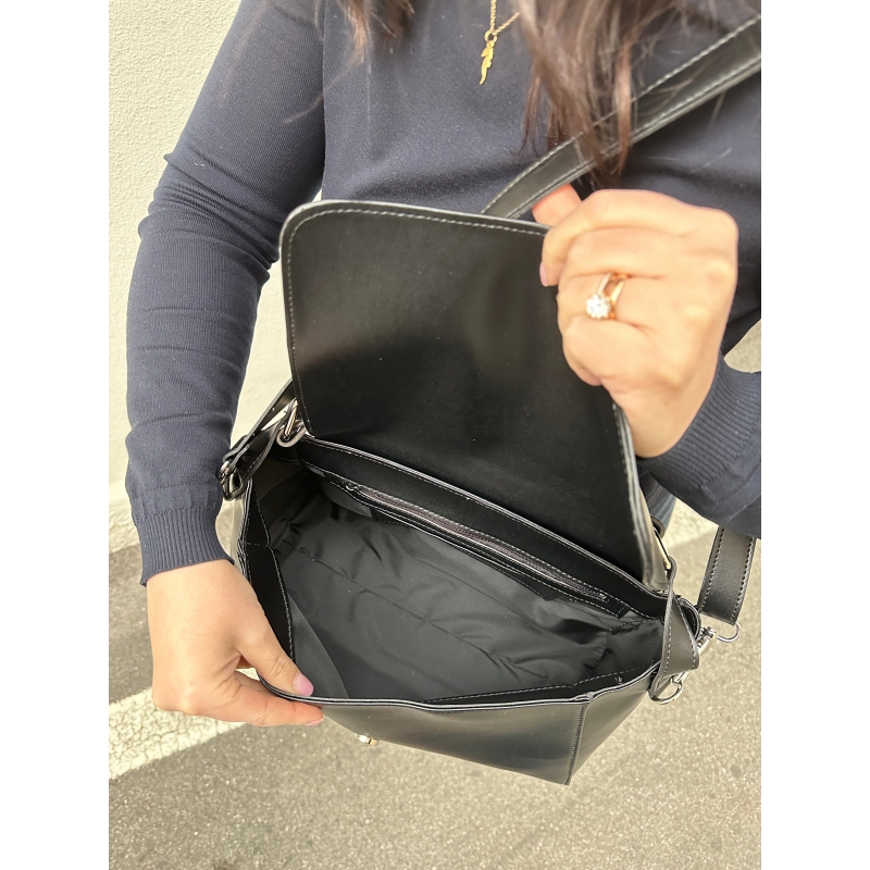 Compartimento interior espacioso único con bolsillo con cremallera y soporte para teléfono móvil.
