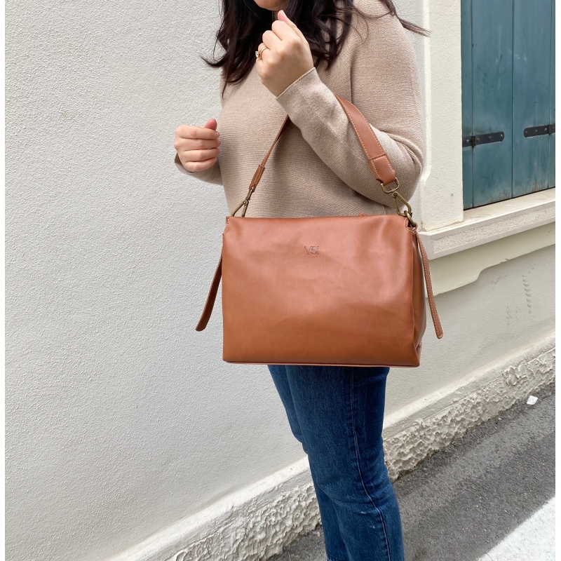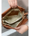 Modelo amplio y espacioso con dos compartimentos internos separados por un bolsillo central con cremallera.
