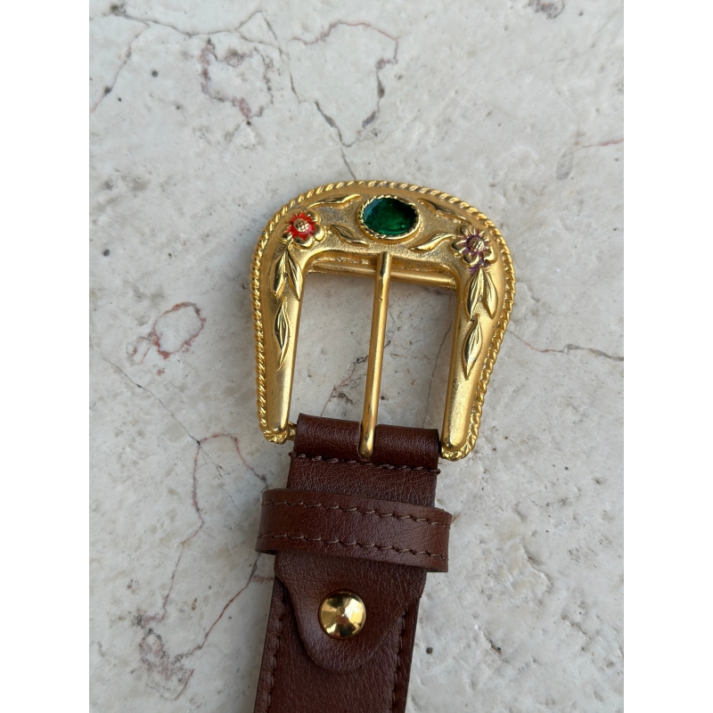 Modelo con gran hebilla plana dorada y detalles coloridos de estilo country.
