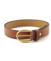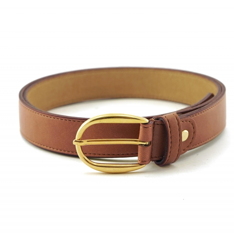 Cinturón ecológico de piel teñida con hebilla fina y redondeada de color dorado.