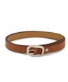 Cinturón fino de piel ecológica color piel con hebilla redondeada plateada.
