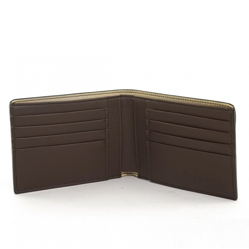 Modelo con 8 ranuras para tarjetas de crédito y doble bolsillo superior para billetes.