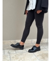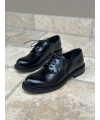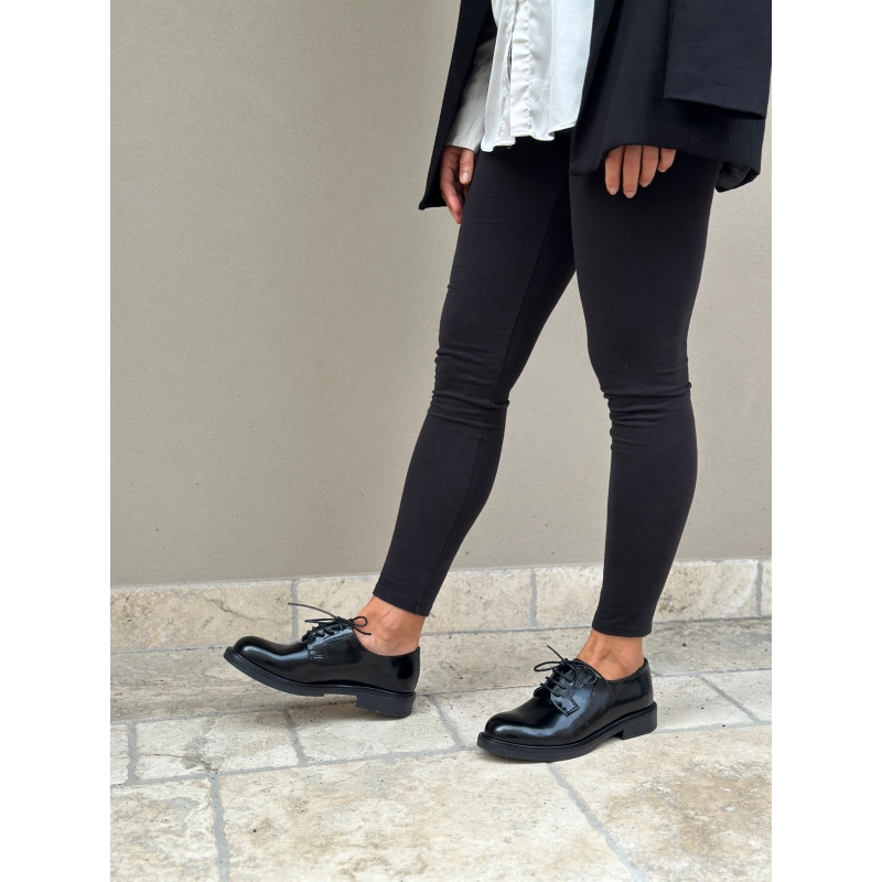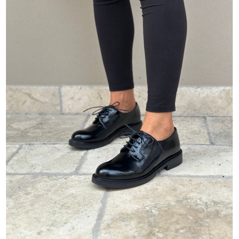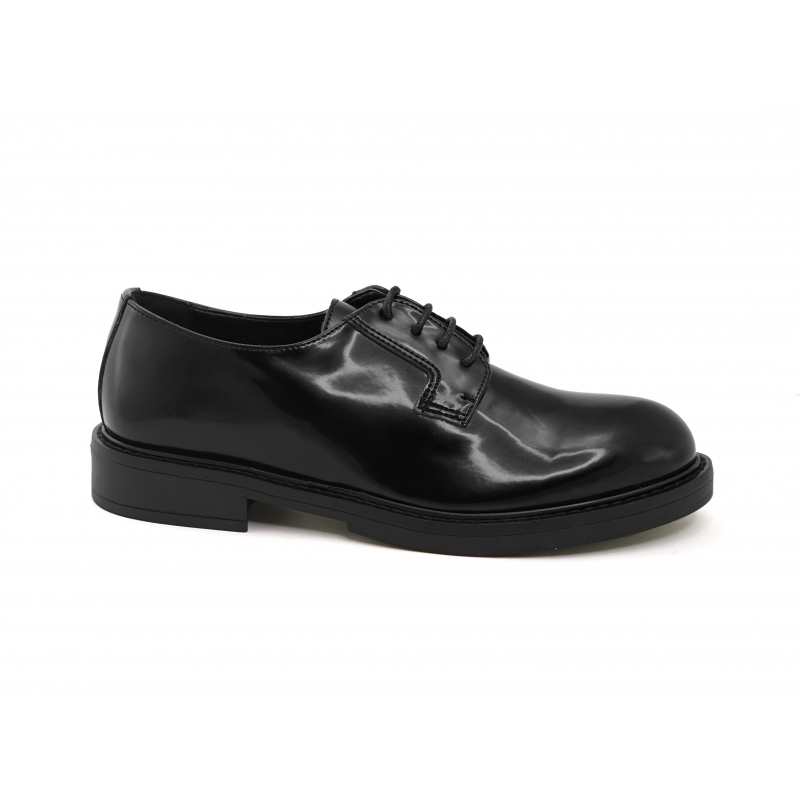 Modelo Derby charol negro, impermeable con cordones.