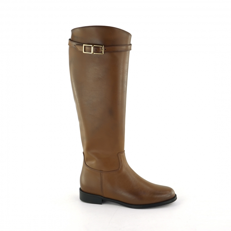 Bota de tubo sencilla y elegante con cremallera y correa ajustable con hebilla dorada.