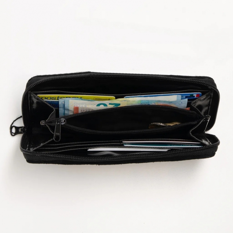 Modelo con 2 compartimentos grandes, 2 pequeños y monedero central con cierre de cremallera