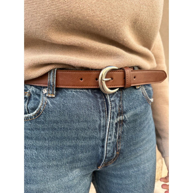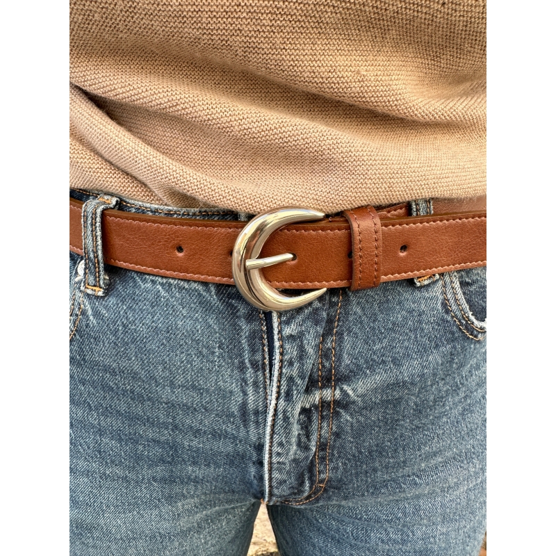 Modelo con hebilla redondeada plateada. Longitud ajustable.