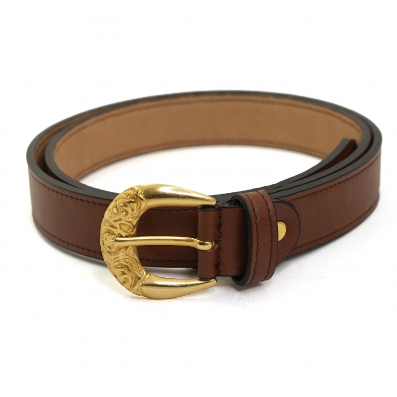 Modelo con hebilla de herradura dorada con adornos grabados. Longitud ajustable.