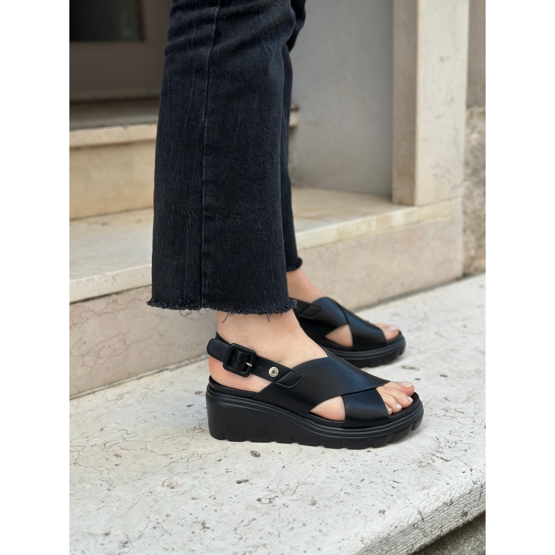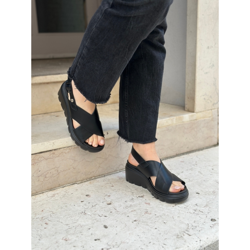 Sandalias veganas negras con plataforma y cuña y tira trasera