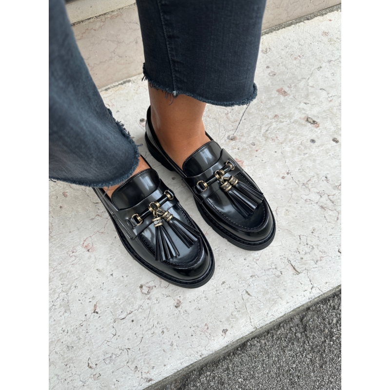 Mocasín vegano negro brillante con bocado y borlas