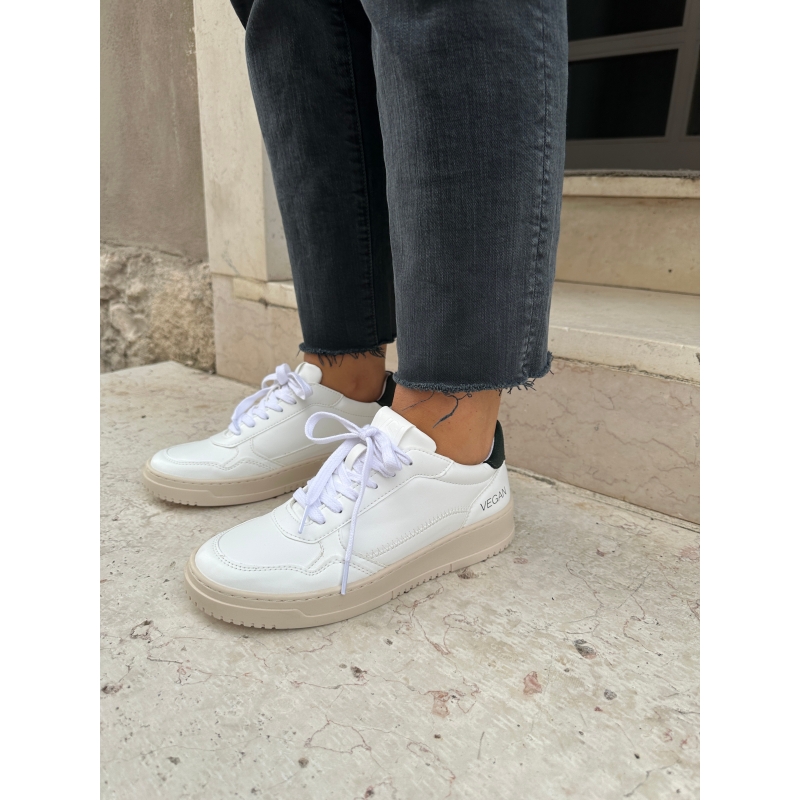 Zapatillas blancas minimalistas y ecológicas para mujer en color maíz con refuerzo en el talón en verde oscuro.