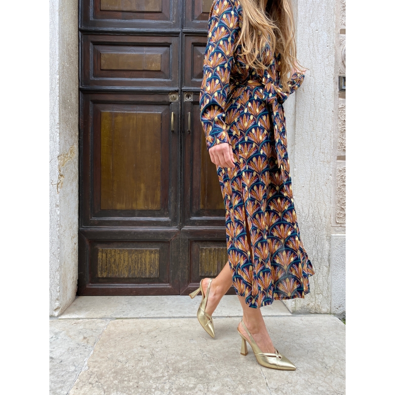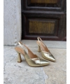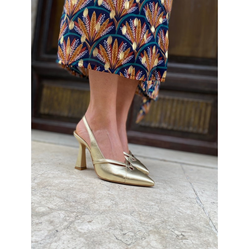 Parte superior de microfibra con efecto metalizado dorado, fabricada en Italia.