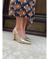 Elegante zapato vegano platino con punta cerrada y tira trasera con trenzado.