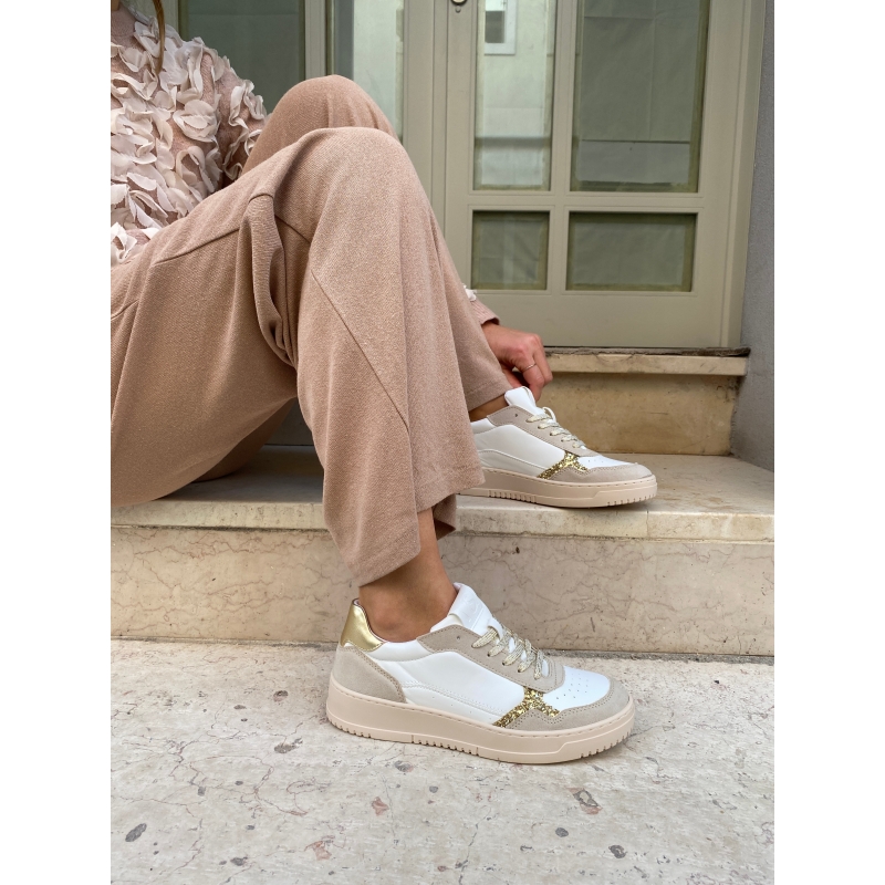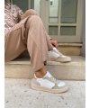 Zapatillas blancas veganas de maíz con refuerzo del talón platino e inserciones beige efecto ante.