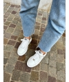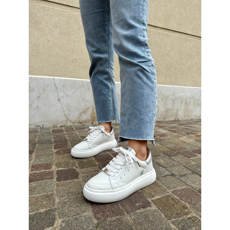 Zapatillas blancas recicladas con refuerzo del talón plateado metalizado.