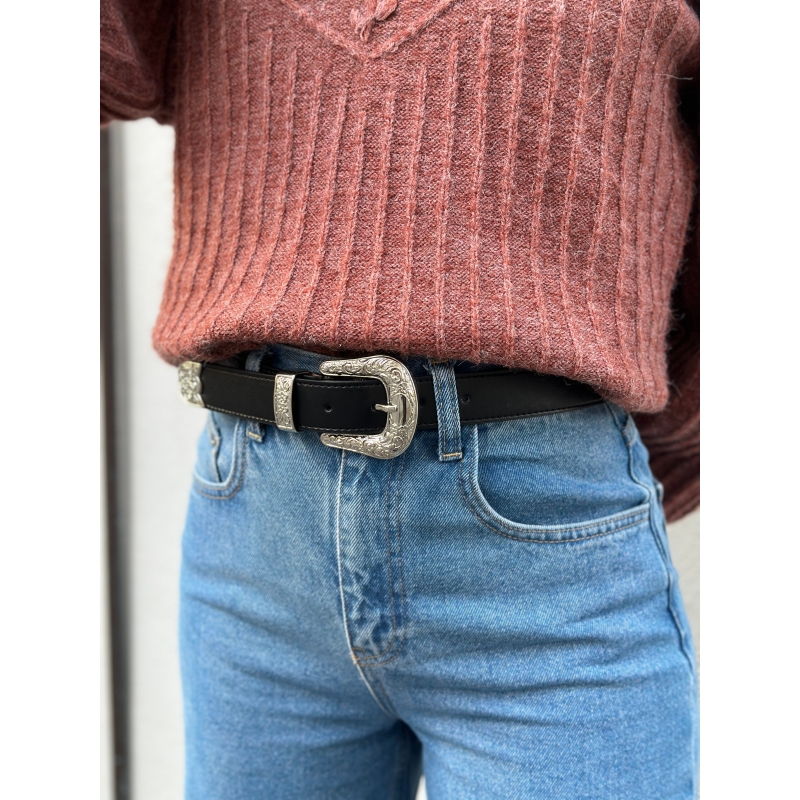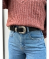 Modèle avec une grande boucle style campagne gravée et un passant en argent travaillé