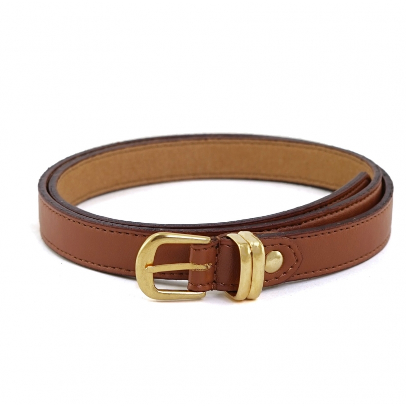 Cintura ecologica sottile tinta cuoio con fibbia stondata dorata e doppio passante metallico oro