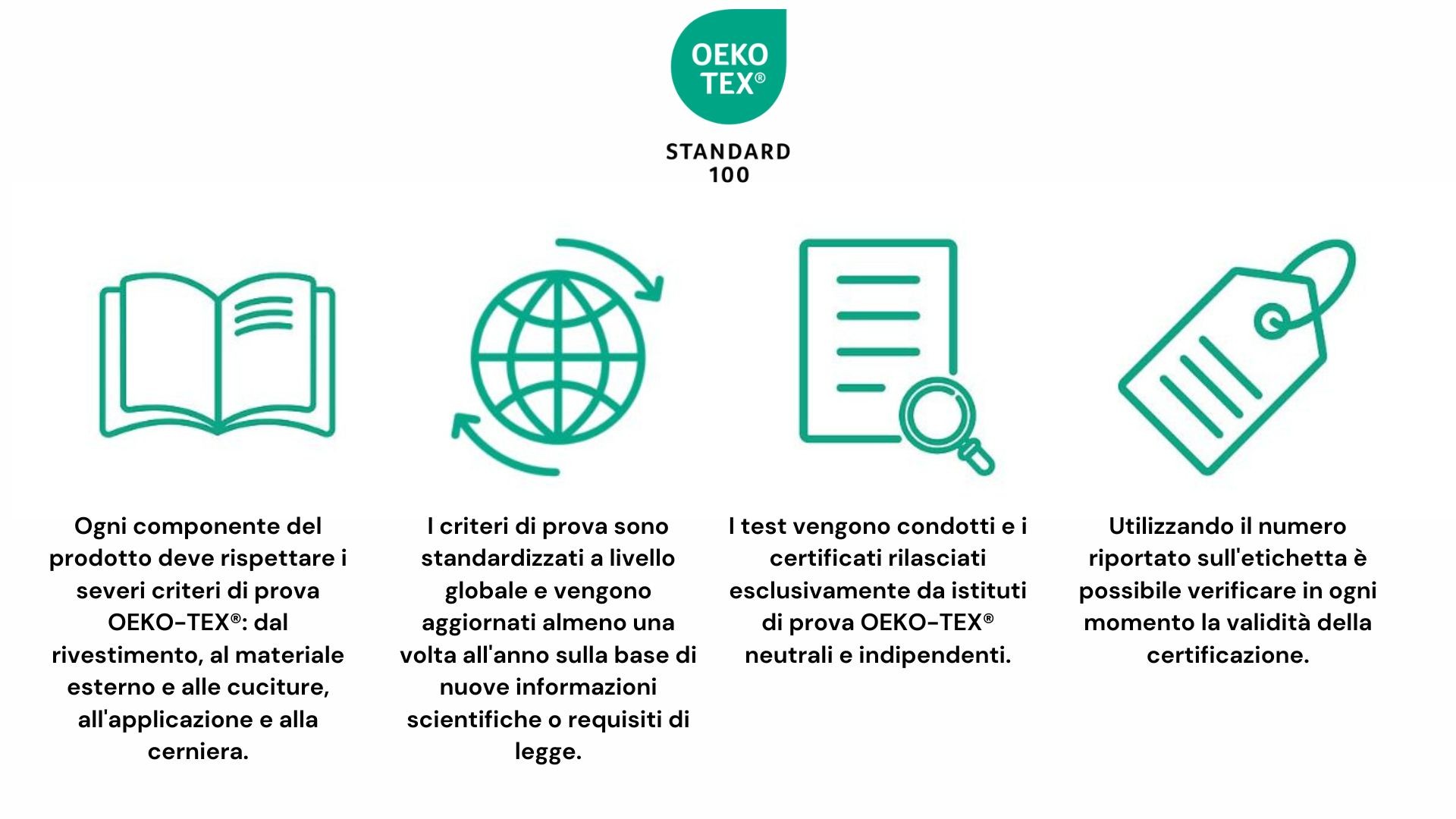 La certificazione OEKO-TEX Standard 100 è uno dei marchi di certificazione più riconosciuti a livello internazionale per prodotti tessili. Questa certificazione garantisce che i tessuti e i materiali utilizzati per la produzione di abbigliamento e tessili siano privi di sostanze nocive per la salute umana e sicuri da utilizzare a contatto con la pelle.