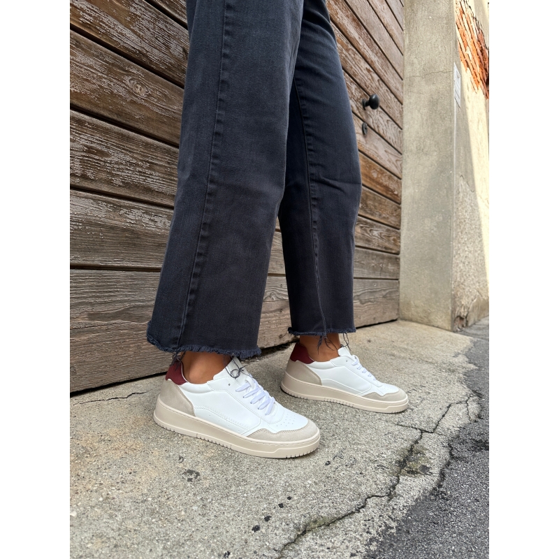 Sneakers vegan in mais bianche con talloncino rosso e inserti beige effetto scamosciato