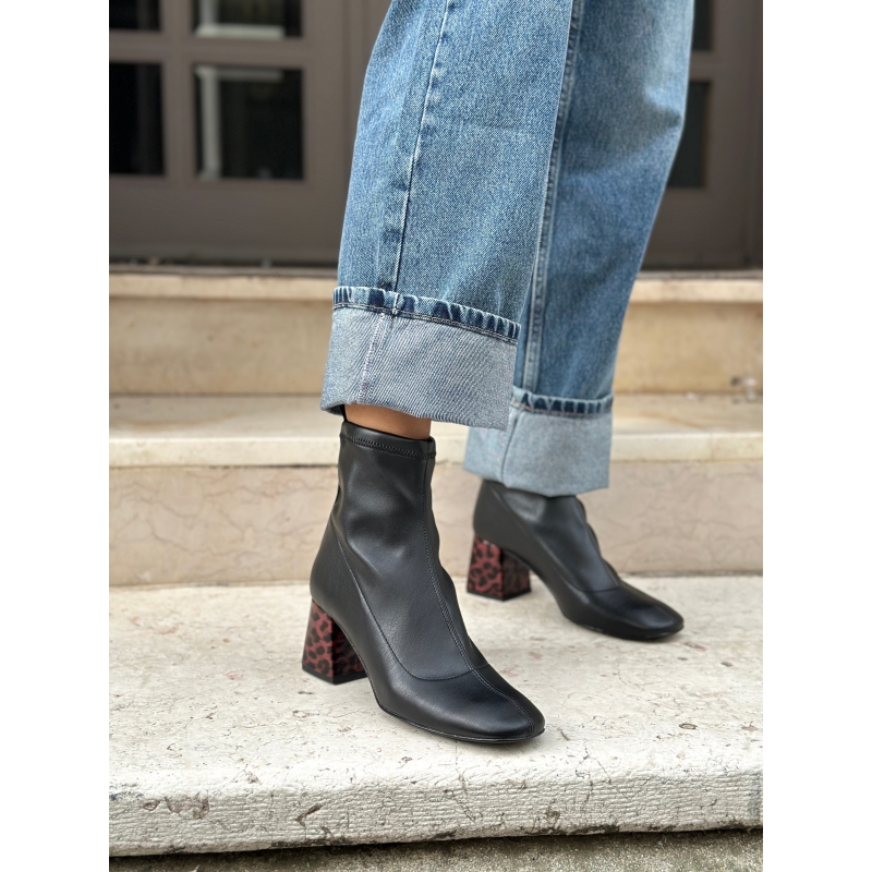 Stivaletti con tacco largo lucido a contrasto fantasia animalier