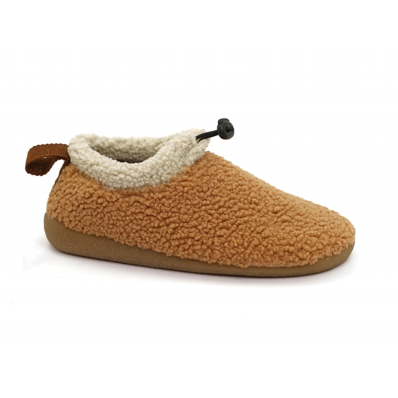 Tomaia in morbido tessuto bouclè peloso color caramello, collarino a contrasto