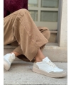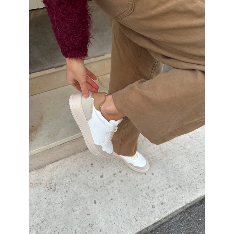 Sneakers vegan in mais bianche con talloncino nocciola e inserti beige effetto scamosciato