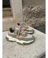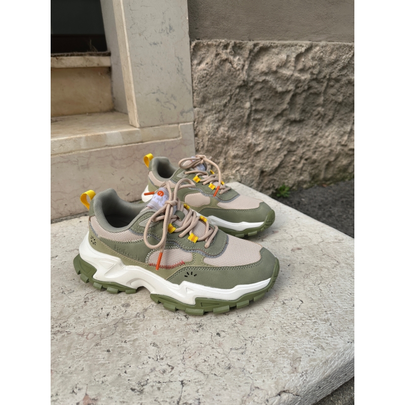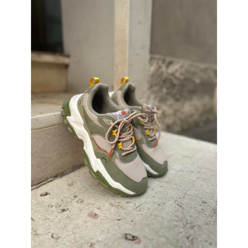 Tomaia in morbida microfibra color salvia con dettagli colorati e inserti in rete