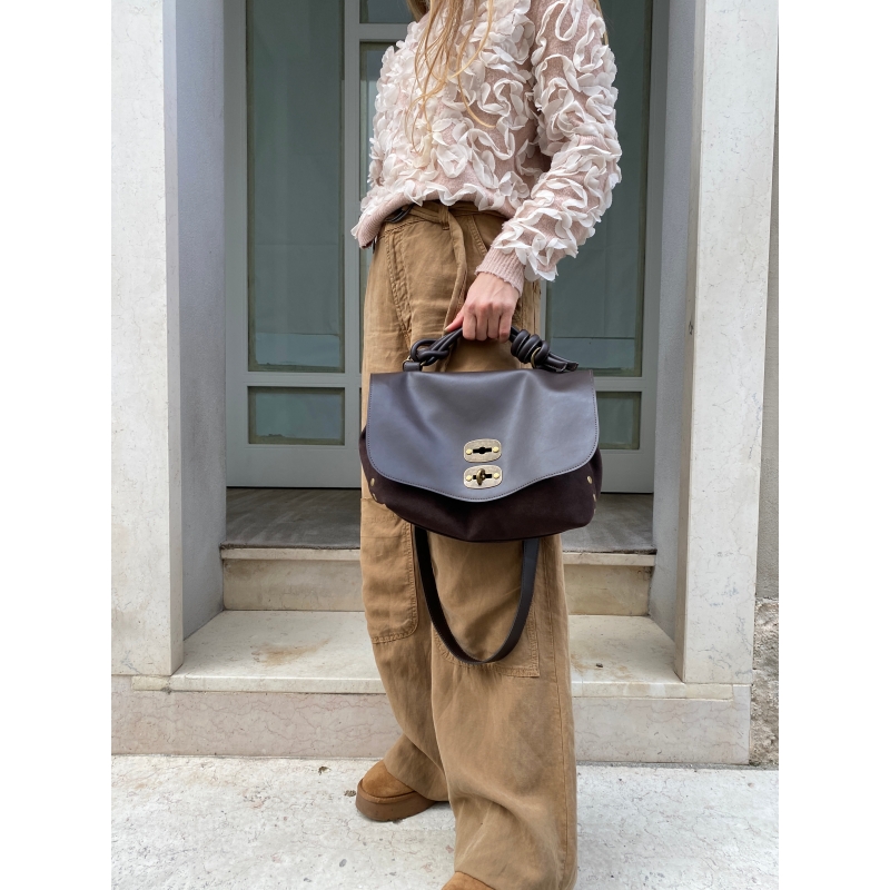 Borsa spaziosa, creata accostando due materiali diversi tono su tono