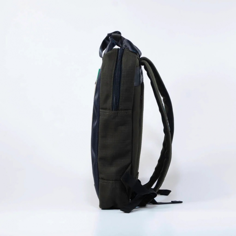 Zaino verde riciclato con chiusura a zip utilizzabile anche come borsa a mano